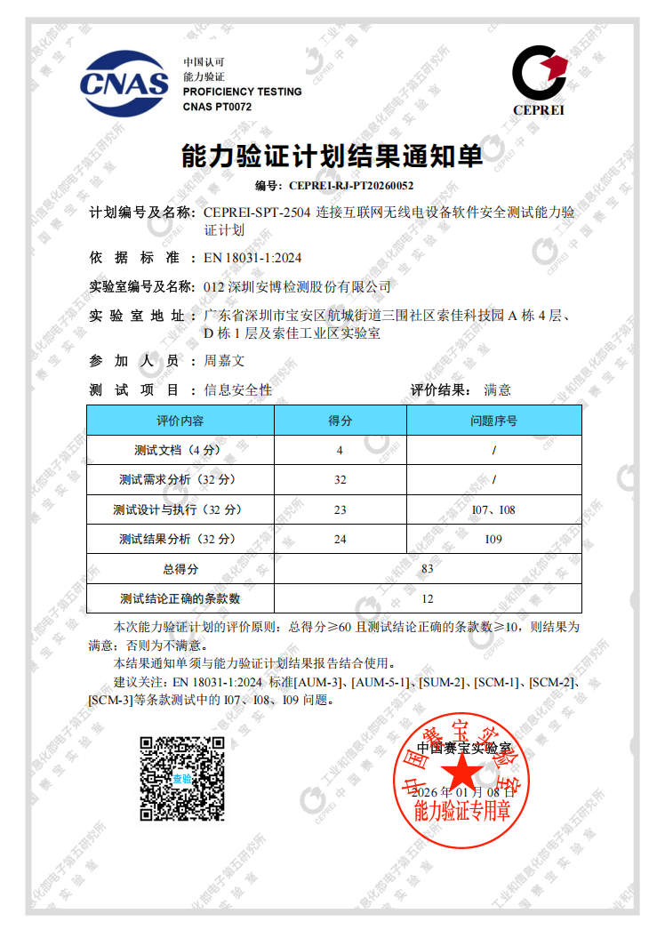 Recently, Anbotek Compliance Laboratory Ltd delivered an outstanding performance in the “Software Security Testing for Internet-Connected Radio Equipment Proficiency Testing Program” organized by China CEPREI Laboratory. Not only did we receive a “Satisfactory” rating with a high score of 83 points and 12 correct test conclusions, but we also ranked among the top-tier laboratories, as only 6 CNAS-accredited labs in China hold recognition for this standard and successfully passed this proficiency test. Our technical prowess has been highly certified by a national authoritative body.